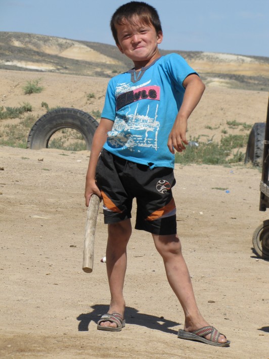 Dans l’une des rares maisons de la route Jeskasgan – Kyzylorda, 3 enfants et un ado jouent (à se tirer dessus)